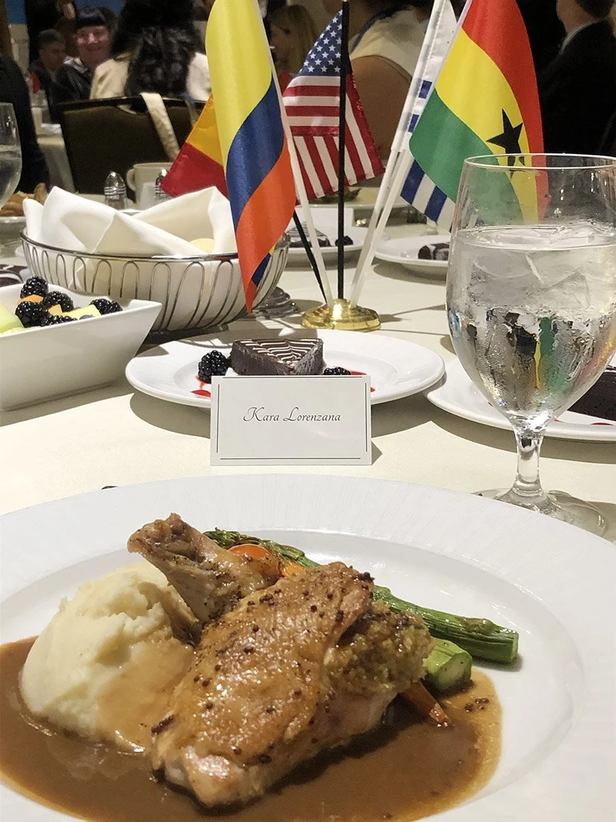 After the reception, we were ushered into the Dolley Madison Ballroom for dinner. I was seated at a table with Fulbright TGC Alumni, folks who worked at the Department of State, and fellow Fulbrighters and their administrators. The person next to me had just had her IFE experience in Colombia the past year and shared a lot of tips and tricks for travel, especially about how to handle potential altitude sickness in Bogota and what souvenirs to bring to your host school/s. After dinner, we all bid each other a good night. It was a good night indeed with rich conversations paired with equally rich dark chocolate cake.